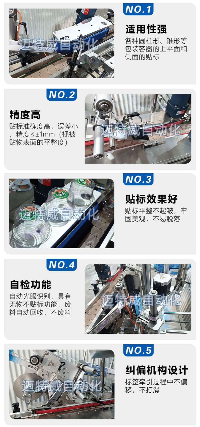應用于各種錐形、圓柱形等包裝容器的上平面和側面的貼標,如塑料瓶、玻璃瓶、塑料罐、紙罐等,通過加定位光電,可以實現2張標簽定位貼標。可單機或在線使用,能同時對被貼物的上平面、側面進行貼標;實現與包裝機、噴碼機、裝箱機等組成無人化聯動線一體化生產。