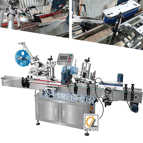 SL-DR全自動錐形瓶上平面+側面貼標機為特制機器,共有兩個貼標頭:一個貼標頭在頂部,另一個貼標頭在側面,它可以給瓶子、罐子貼上2張標簽,一張貼在頂部,另一張貼在側面??蓪崿F頂標和側標的定位貼標。