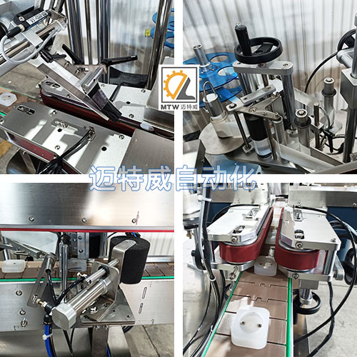 應(yīng)用于不易站立圓柱體或異形容器的上平面和側(cè)面的貼標(biāo),針對(duì)特殊瓶設(shè)計(jì)定制的,輸送帶上加定位模具,固定產(chǎn)品,實(shí)現(xiàn)2張標(biāo)簽貼標(biāo)。